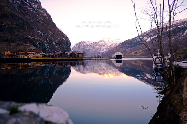 黃昏時的夕陽將夢幻粉色渲染了整個Flåm小鎮